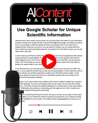 AI Content Creation Masterclass: Complete step-by-step training showing you how to create information products that are unique and informative using AI tools like ChatGPT, NotebookLM, and advanced research systems.